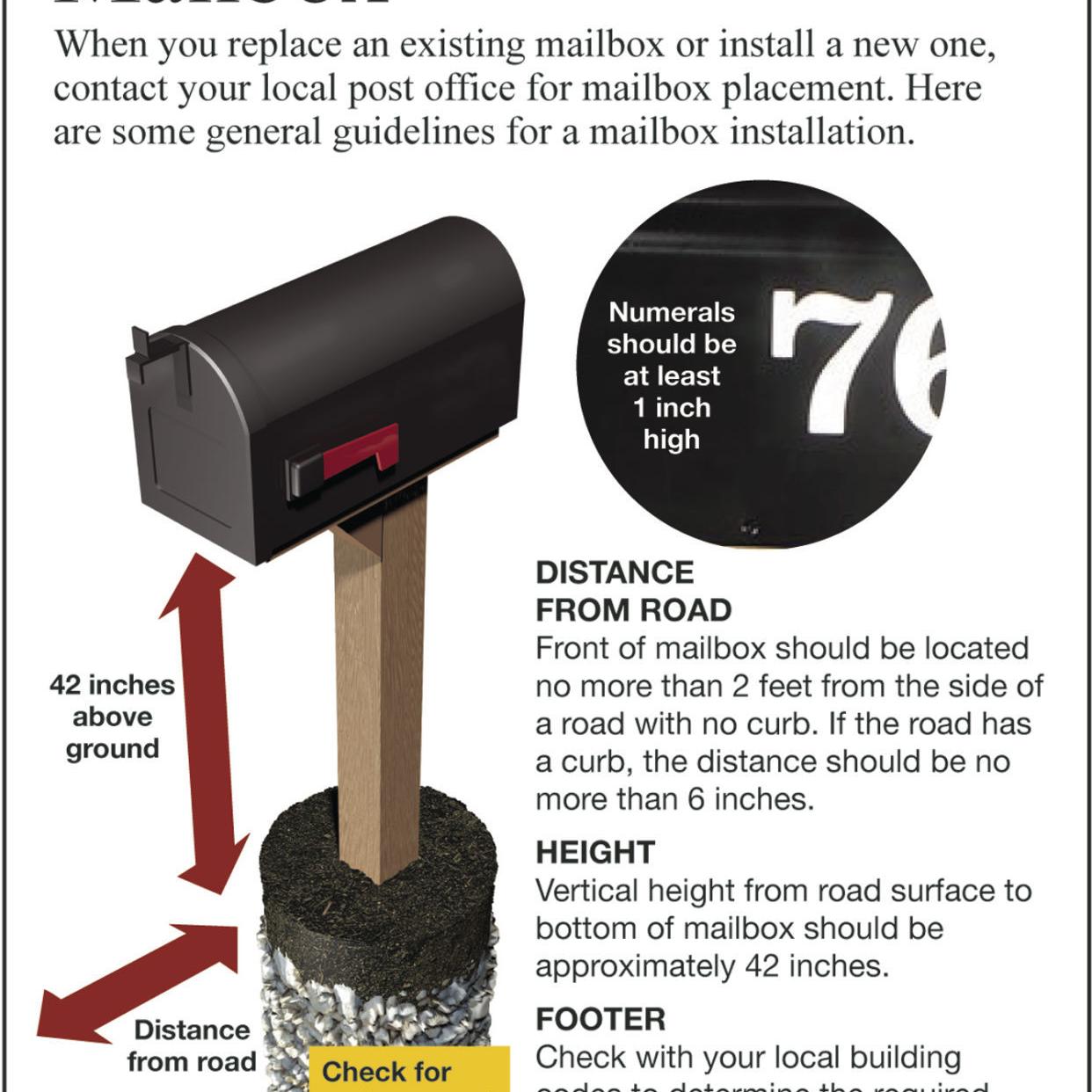 Your mailbox door must be 6. The lettering for the name and address on the mailbox should be at least 1 high. There must be 41 to 45 inches of height from the street up to the bottom of your mailbox door.